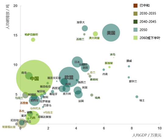 2021年政府报告指出,中国当年将制定2030年前碳排放达峰行动方案,碳减排的相关工作和举措将加快进入实行阶段,并于3月15日召开的中央财经委员会第九次会议中得到重点强调。中国已正式将“碳中和”理念纳入生态文明建设顶层布局,相比于其他国家而言显示了强大的政策效率和执行力度,时间目标更为清晰和明确。